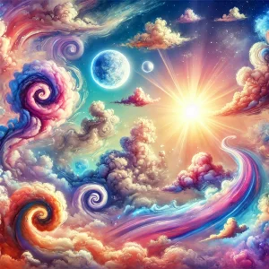 DALL·E 2024-10-06 15.51.00 – A dreamsical sky with the sun shining brightly in one corner, casting light over surreal, imaginative clouds in all kinds of shapes. Some clouds are s copy