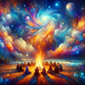 DALL·E 2024-03-02 08.14.23 – A serene gathering of people around a fire, with the flames revealing visions of a psychedelic universe. The sky is a canvas of otherworldly colors an